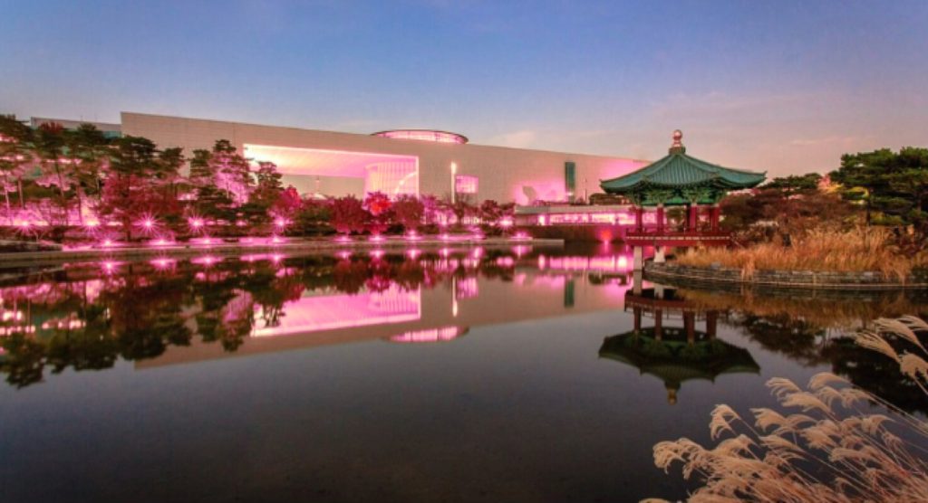 The National Museum of Korea’s outdoor grounds illuminated in pink