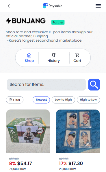 Paysable has partnered with Bunjang to provide a feature that lets you search and order Bunjang products directly within the Paysable site. Shop conveniently at Bunjang Product List just like online shopping.
