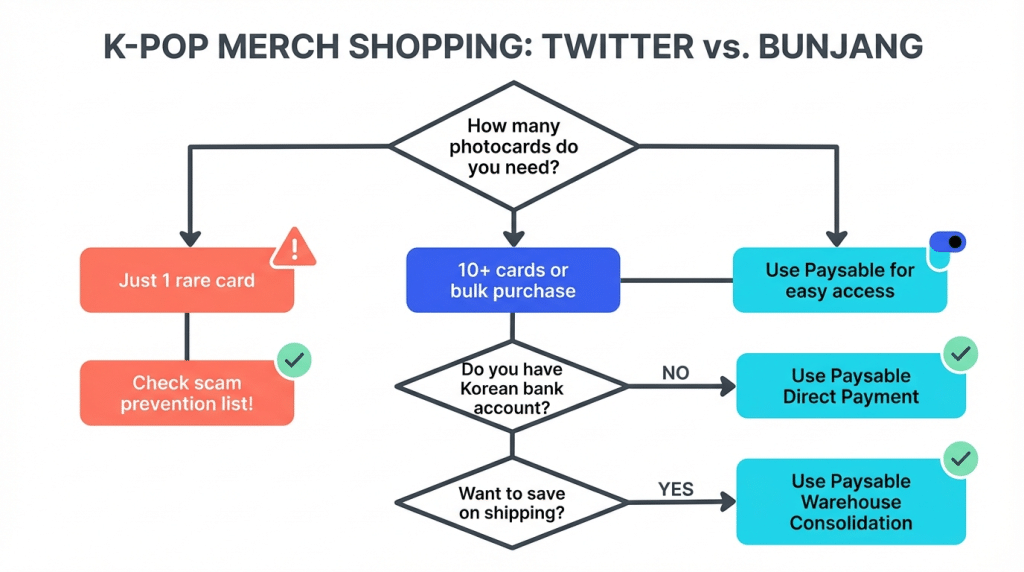 Twitter and Bunjang each have clear advantages. We recommend a two-track strategy: hunt for rare items on Twitter and bulk purchase regular photocards on Bunjang.