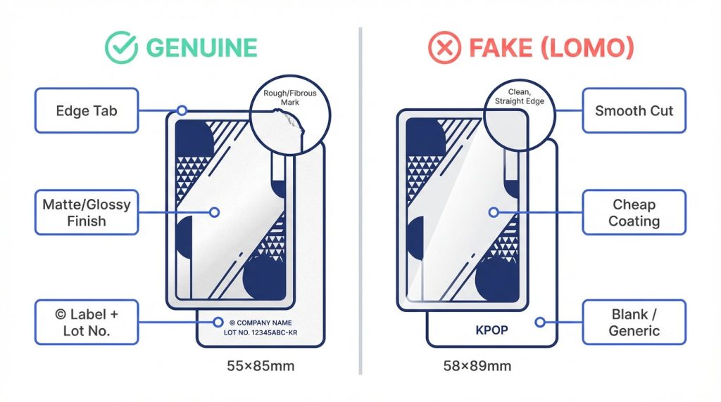 This is the easiest place to start. Genuine photocards measure 55 × 85mm (some die-cut variations fall within a 54 × 86mm tolerance), and weigh approximately 1.8–2.2g. Lomo cards are typically 58 × 89mm — 3–4mm larger in both dimensions.