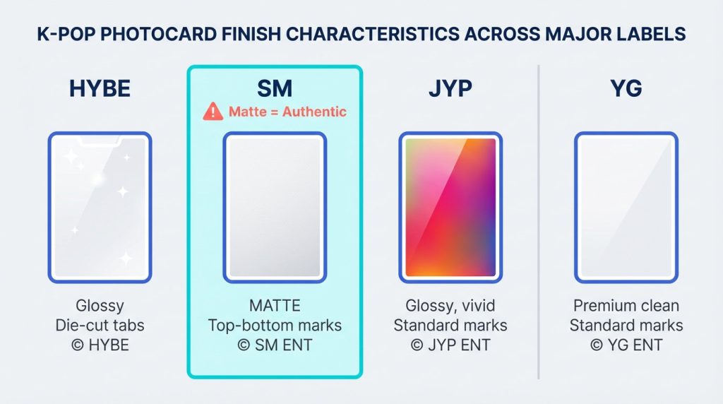 | SM (NCT, aespa, RIIZE) | Matte | Protruding marks on top/bottom edges | “© SM ENTERTAINMENT” + lot number | Up to ~50 card variations per album; matte texture is key |