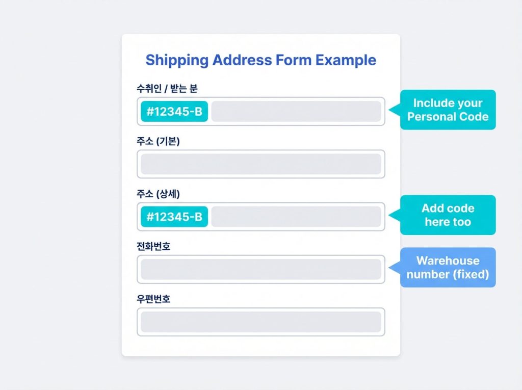 💡 Tip: The My Korean Address section already shows your complete address with your Personal Code included. No need to assemble anything yourself — just copy the address shown and paste it into the shipping field. Save it to your notes app if you order frequently.