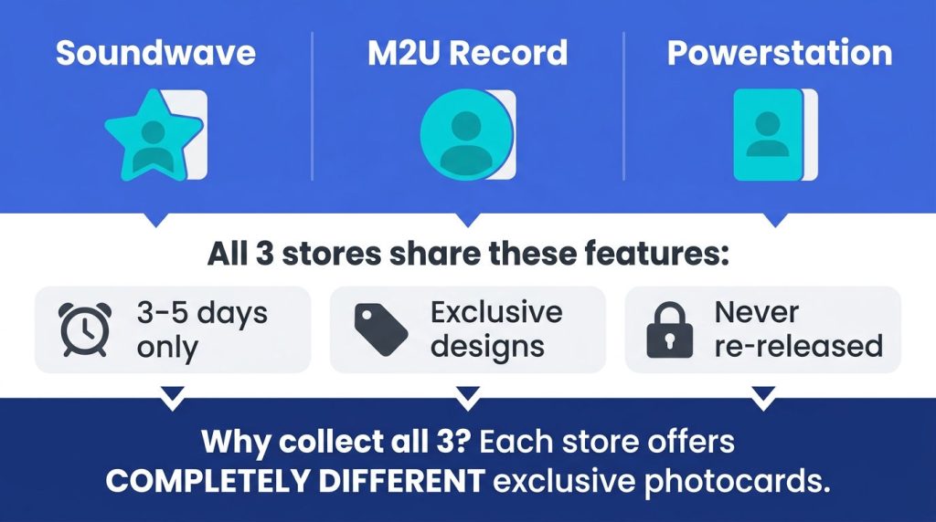 K-pop entertainment companies sign exclusive licensing deals with Soundwave, M2U Record, and Powerstation separately. For many artist promotion cycles — including groups like SEVENTEEN, TXT, and ENHYPEN — all three retailers offer entirely different sets of exclusive photocards.