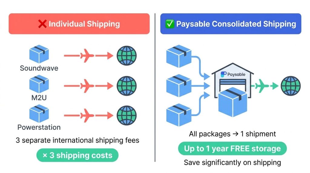 | International shipping | 3 separate payments | Bundled into 1 shipment |
