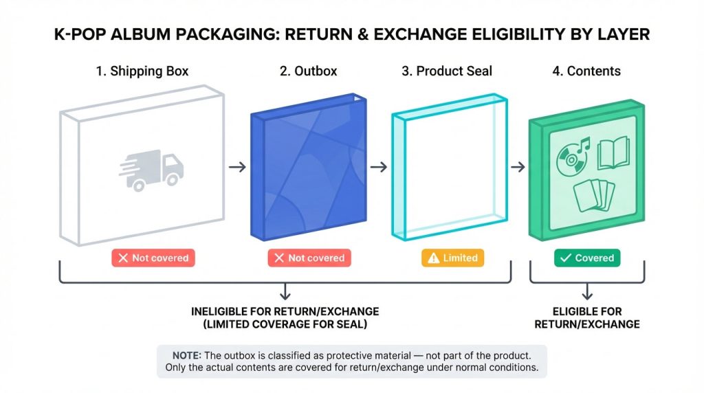 The 4-layer packaging structure of a K-pop album. The outbox is classified as “protective material” by sellers and is excluded from return/exchange eligibility.