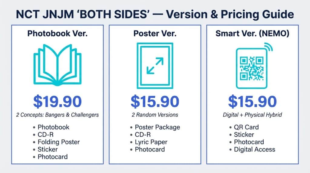 NCT JNJM’s ‘BOTH SIDES,’ releasing on February 23, 2026, comes in three versions: Photobook, Poster, and Smart (NEMO). If you’re a Group Order Manager (GOM), you need to account for not only the album price but also domestic shipping, payment fees, warehouse import fees, and international shipping costs.