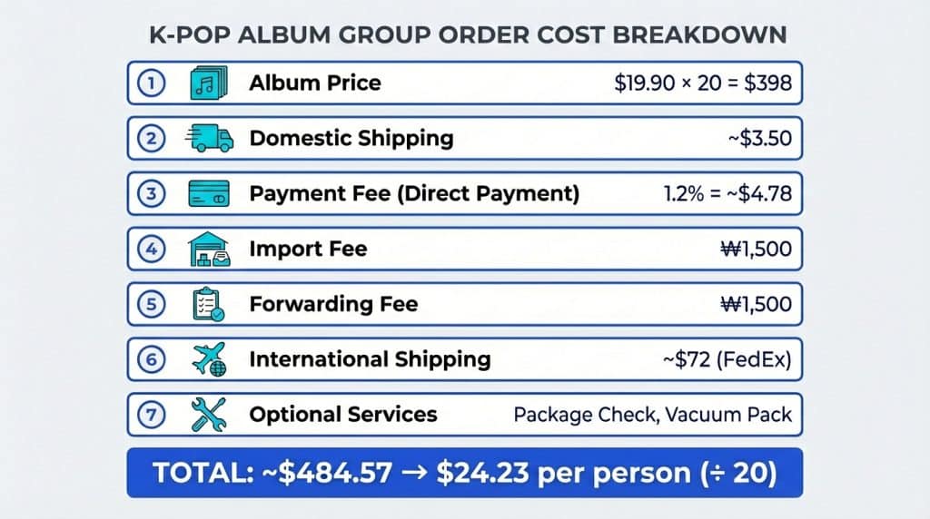 → Don’t worry! The cost structure of a Group Order (GO) may seem complicated at first, but once you break it down step by step, anyone can calculate it systematically. Read our complete guide to becoming a K-pop Group Order Manager for everything you need to know.